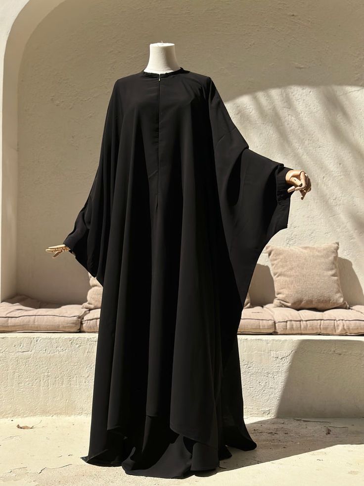 This is a timeless and elegant Jet Black Batwing Abaya, offering a classic silhouette that prioritizes both modesty and effortless style. It is the ultimate wardrobe essential for those who appreciate minimalist grace.Product Features:Color: Deep Jet Black, providing a versatile and high-contrast look that never goes out of fashion.Design: An expansive Batwing / Butterfly silhouette, featuring wide sleeves that merge into the body for a fluid, continuous drape.Fabric: Made from premium, breathable fabric (such as Nida or Matte Crepe) that is opaque yet light enough to flow beautifully as you move.Neckline: A clean, modest round neckline equipped with a discreet front zipper, making it practical and nursing-friendly.Cuffs: Includes fitted elastic or buttoned inner cuffs to ensure the sleeves stay in place while maintaining full arm coverage.