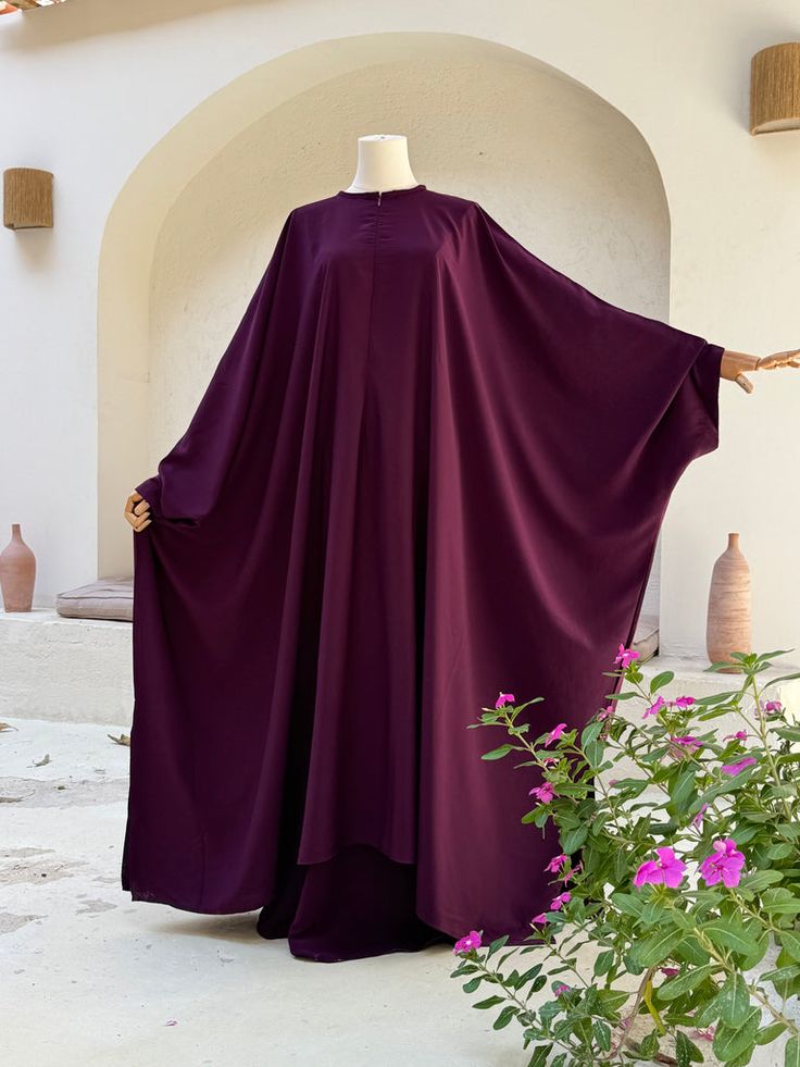 This is a stunning and sophisticated Plum Purple Batwing Abaya, designed to offer a perfect blend of modesty, comfort, and contemporary style. Its oversized silhouette ensures a graceful drape for any occasion.Product Features:Color: Rich Deep Plum / Wine, a regal shade that exudes elegance and complements various skin tones.Design: A classic Batwing or Butterfly cut, providing a wide, airy fit that allows for maximum movement and a flowy aesthetic.Fabric: Crafted from premium, lightweight fabric (likely Nida or high-quality Crepe) known for its smooth texture and beautiful fall.Neckline: Features a modest round neckline with a subtle front zipper or button closure for ease of wear.Fit: An Oversized / Free-size fit that provides full coverage while maintaining a stylish, modern look.